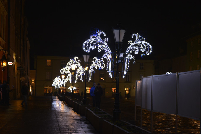 漂亮的克拉科夫建築街道與聖誕燈飾相輝映。